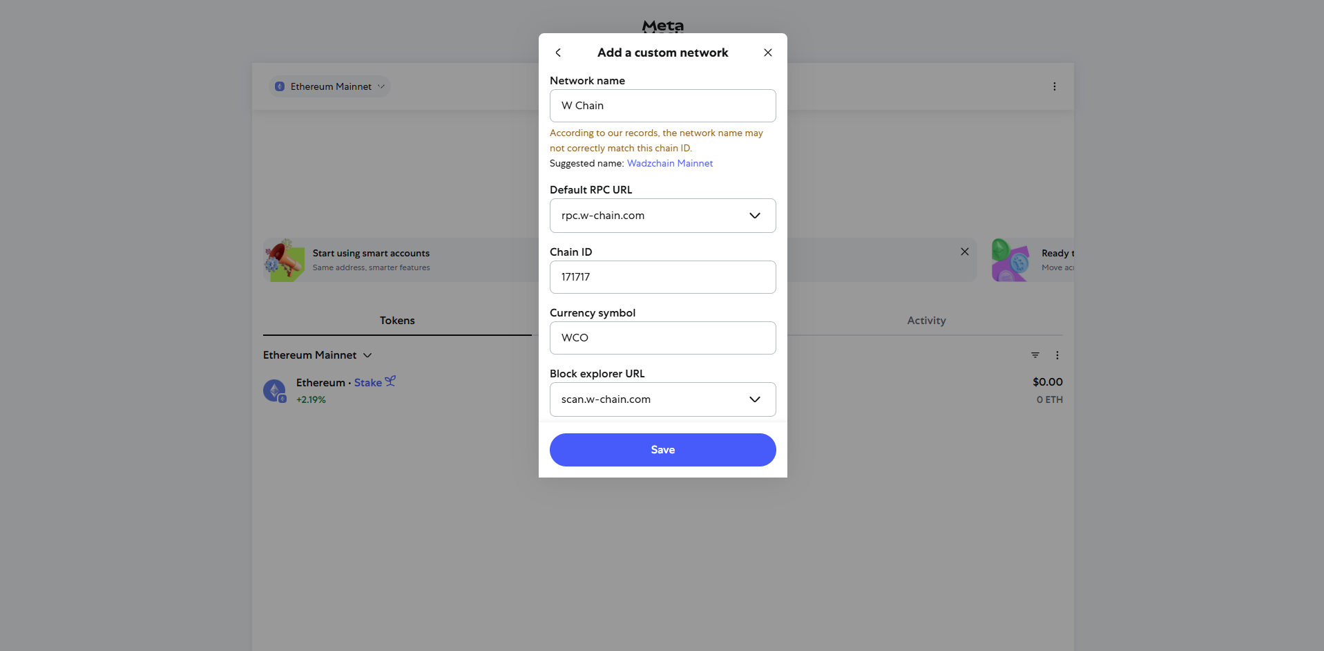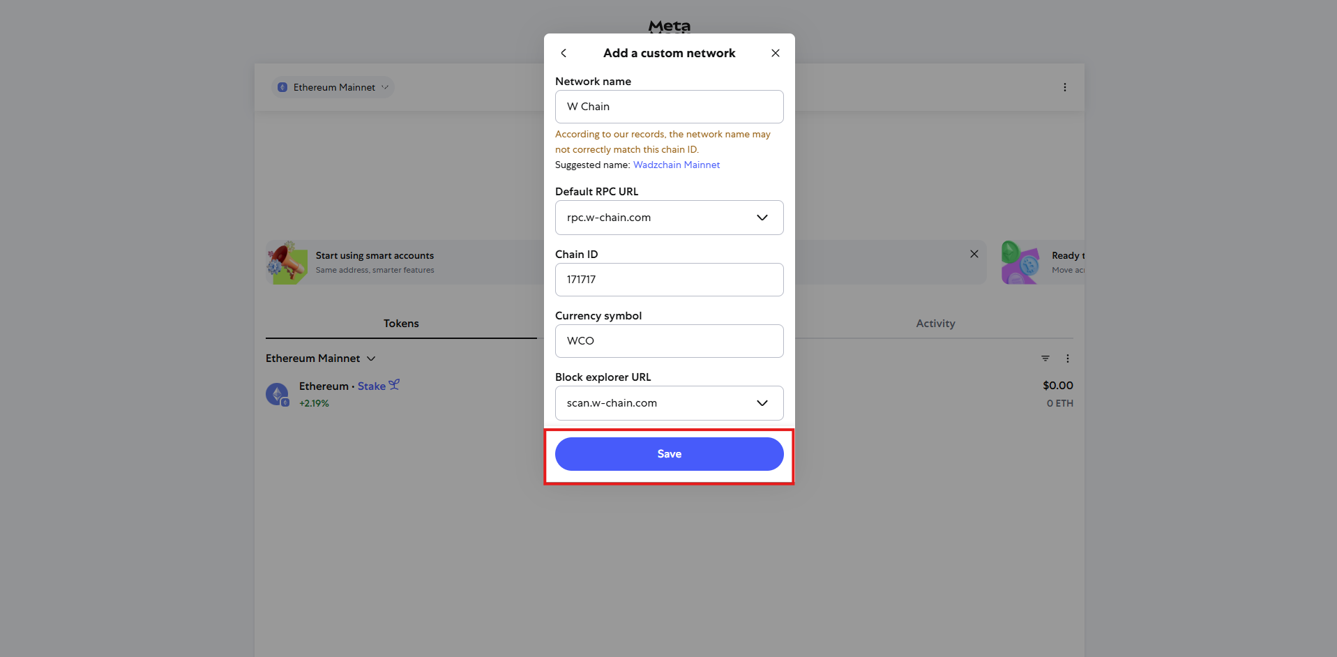 Fill in the required fields with the W Chain Network details: