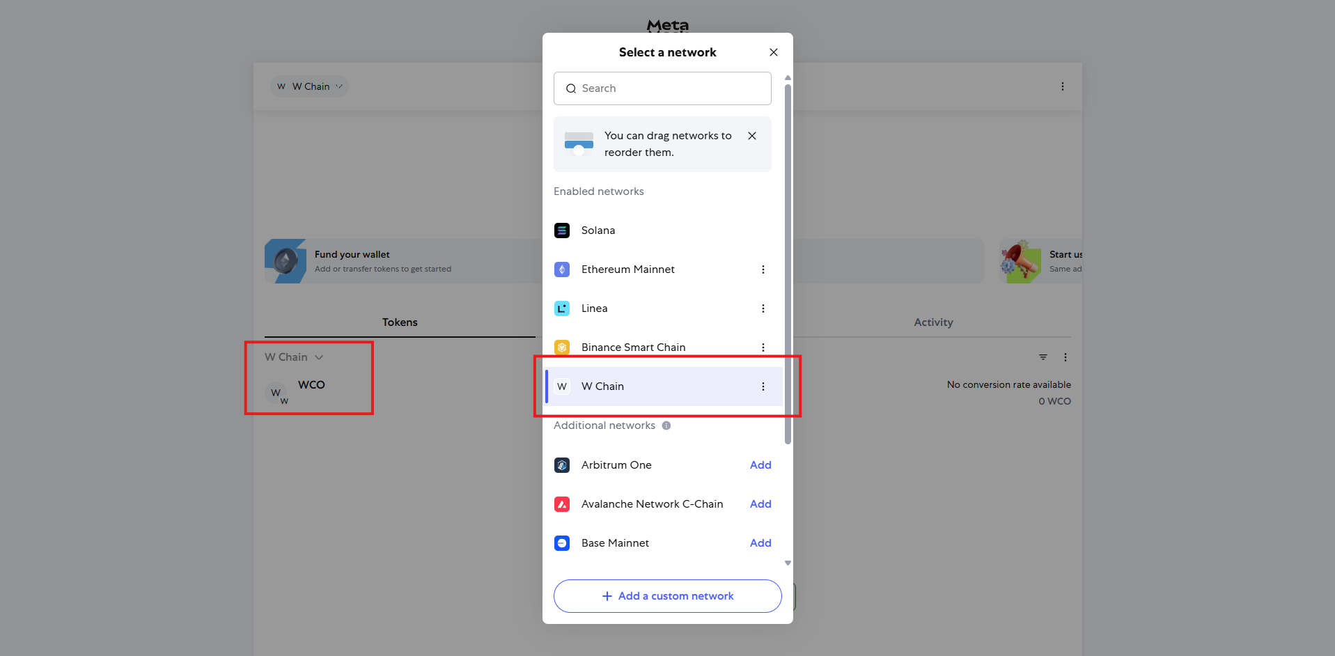 - Switch to the W Chain network by selecting it in the network dropdown.