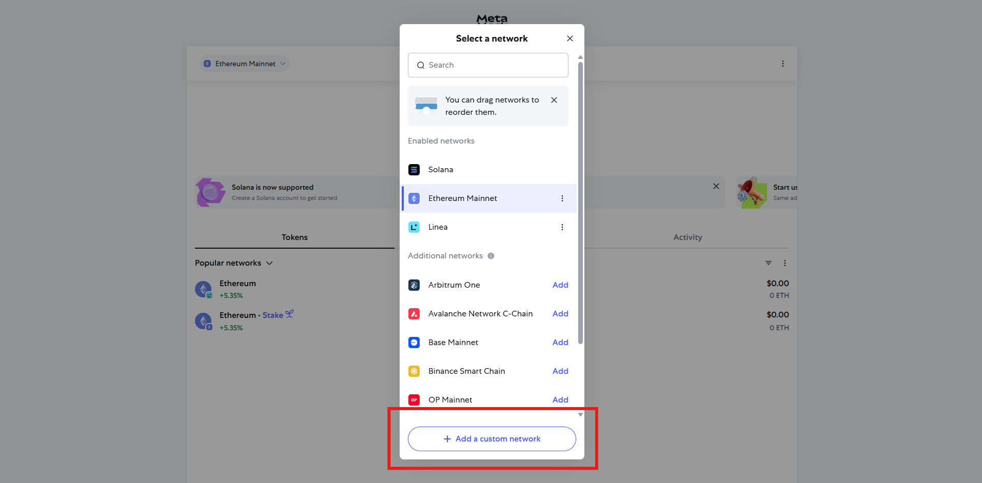 - Click on “Add Network” or “Custom RPC.”