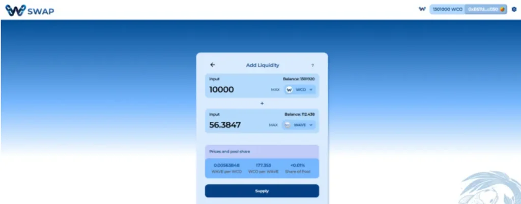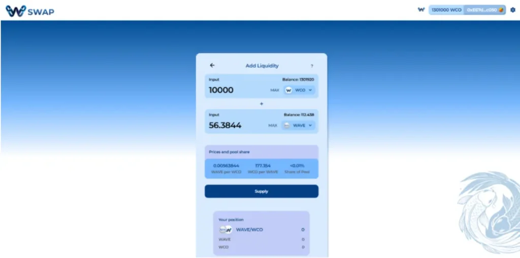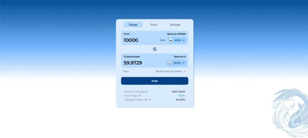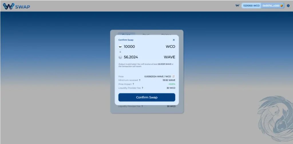 Choose the token you want to swap from (e.g., WCO) in the “From” field and the token you want to receive (e.g., WAVE) in the “To” field.