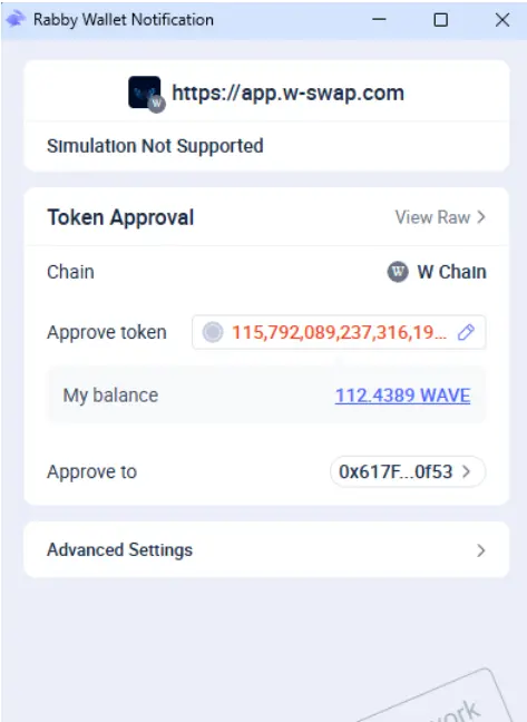 - Approve Token (First Time Only): If you haven’t swapped this specific token before, you’ll need to click “Approve” and confirm the transaction in your wallet. This allows W Swap to iteract with your tokens.